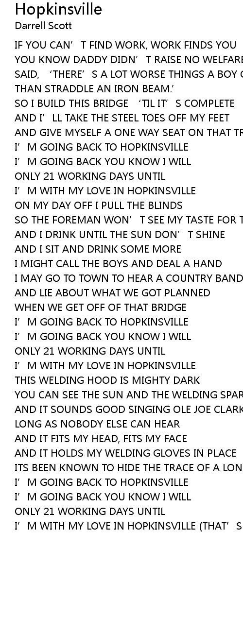 | AND GIVE MYSELF A ONE WAY SEAT ON THAT TRAIN TO HOPKINSVILLE | |