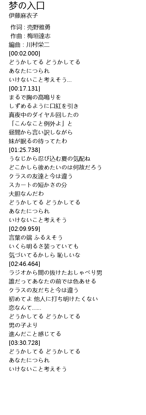 | [02:41.295] | 気づいてるかしら 恥しいな |