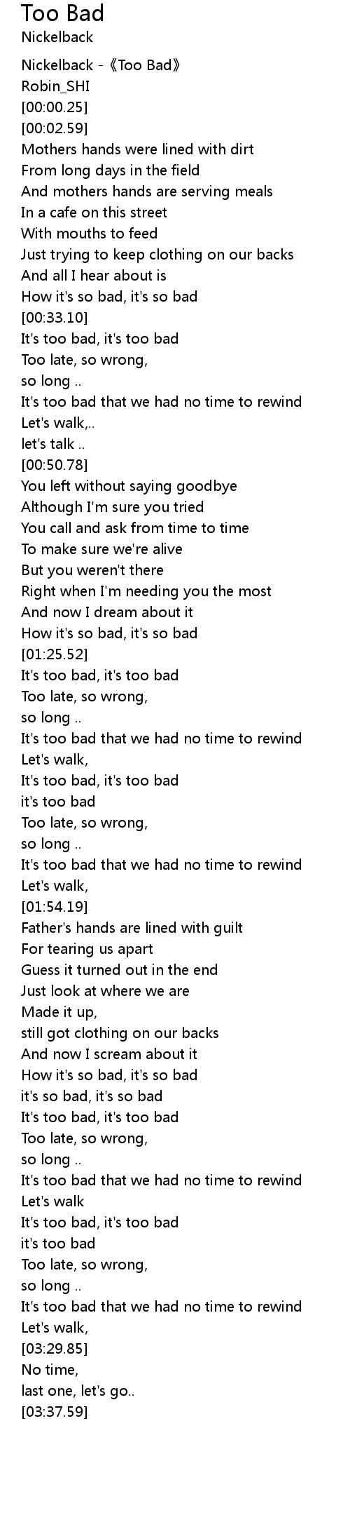 | [00:-3.25] | Nickelback -《Too Bad》 |