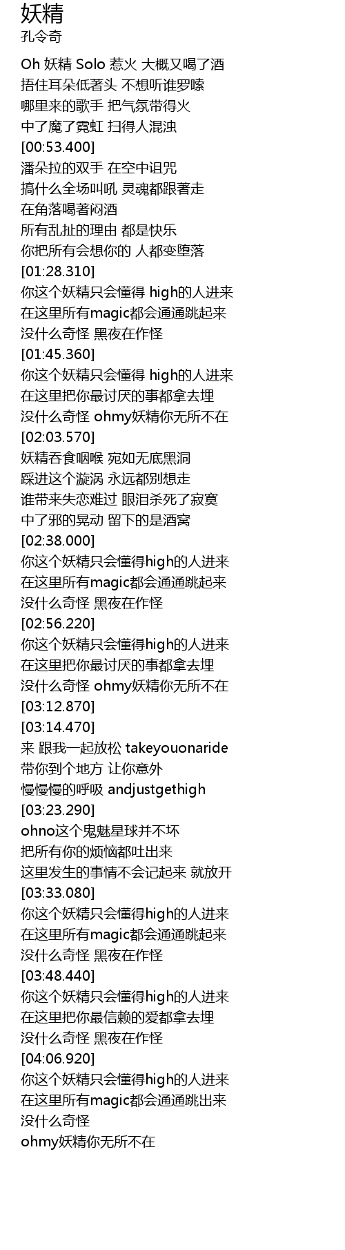 | [00:25.000] | Oh 妖精 Solo 惹火 大概又喝了酒 |