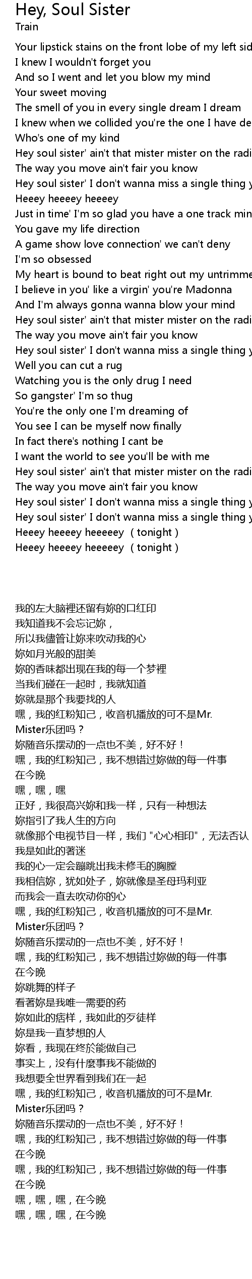 | [03:00.880] | Hey soul sister' I don' t wanna miss a single thing you do tonight |