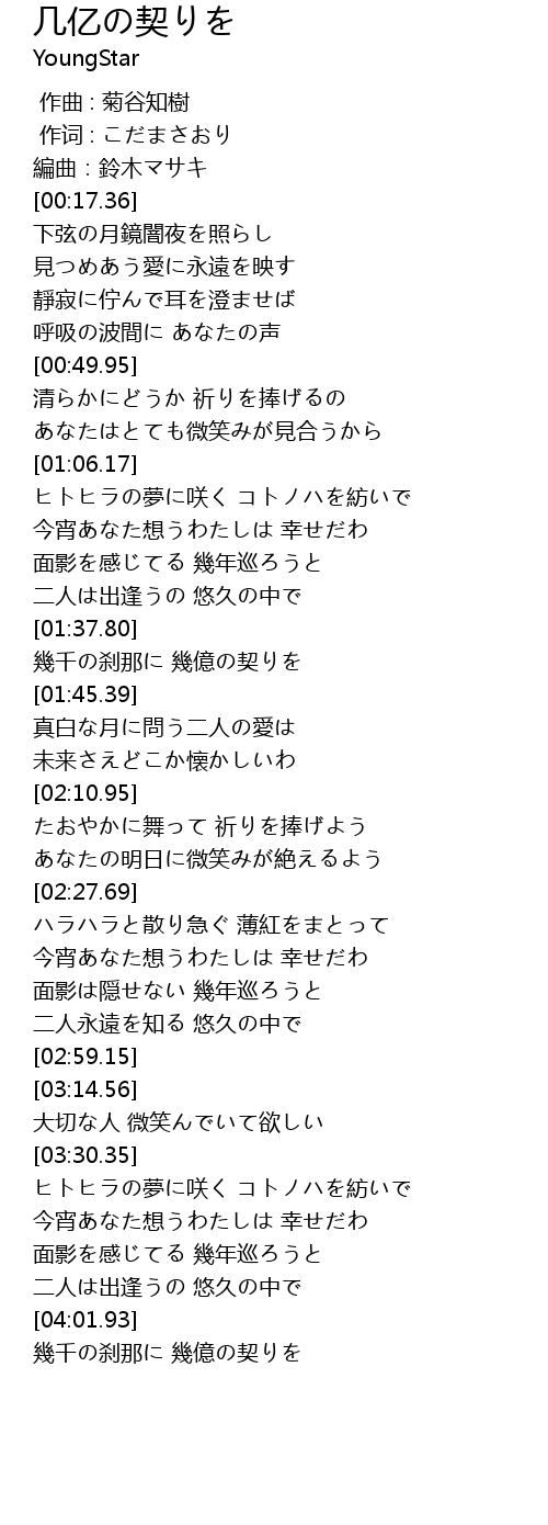 | [04:02.44] | 幾千の刹那に 幾億の契りを |