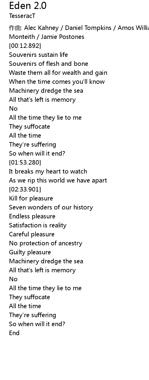 | [00:00.849] | 作曲: Alec Kahney / Daniel Tompkins / Amos Williams / James Monteith / Jamie Postones |