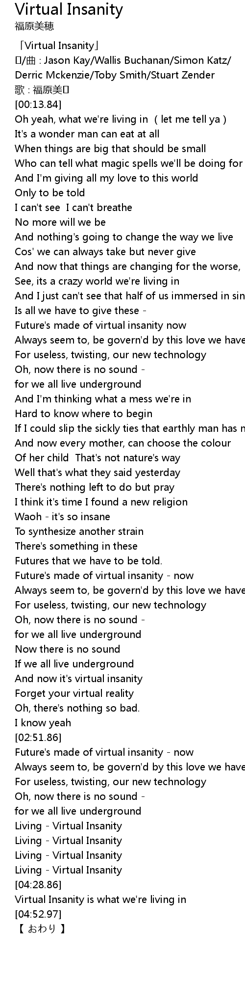 | [04:49.21] | Virtual Insanity is what we' re living in |