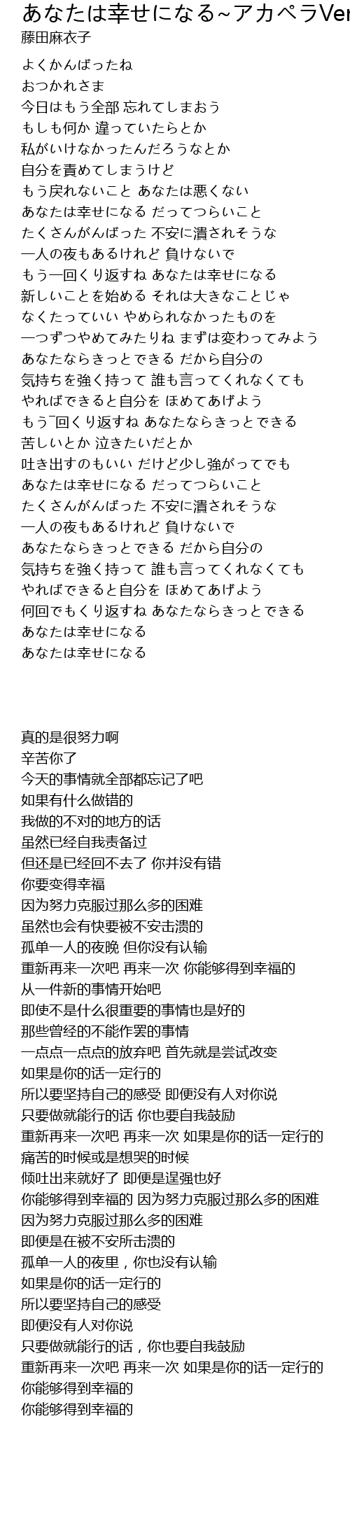 | [01:16.150] | もう一回くり返すね あなたは幸せになる |