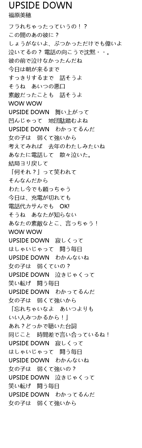 | [02:57.15] | UPSIDE DOWN わかってるんだ |