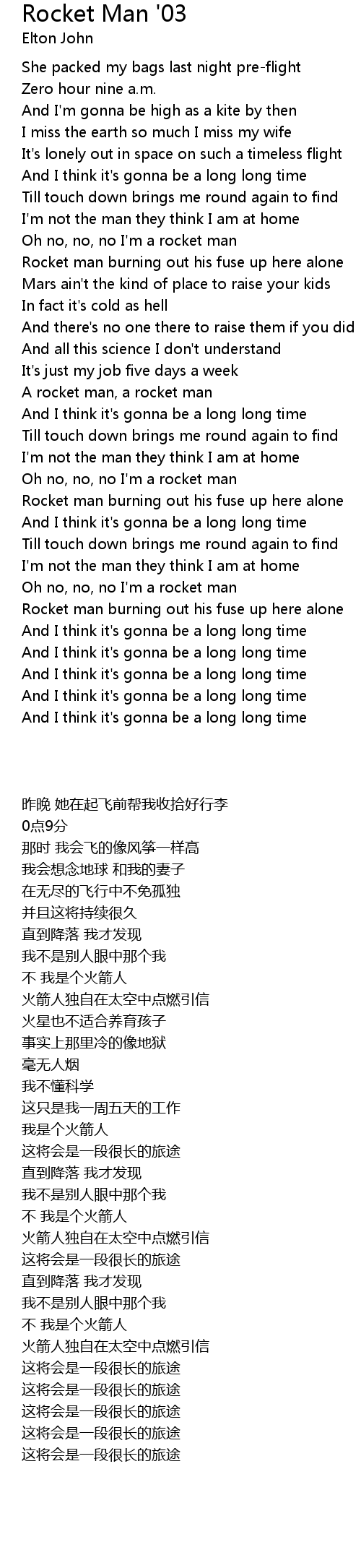 Oh no, no, no I'm a rocket man |