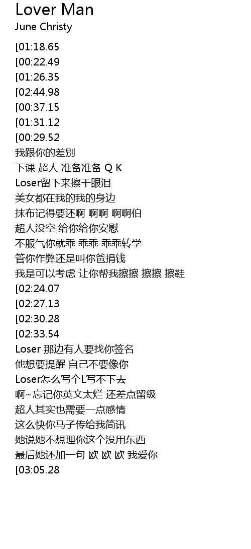 | [02:43.24][02:44.98][02:46.60][02:56.66][02:58.16][02:59.60] | year~我是superman |