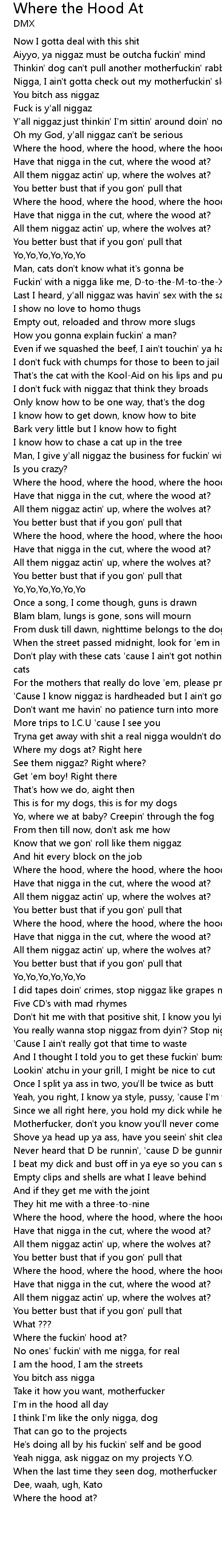 Where the hood, where the hood, where the hood at? |