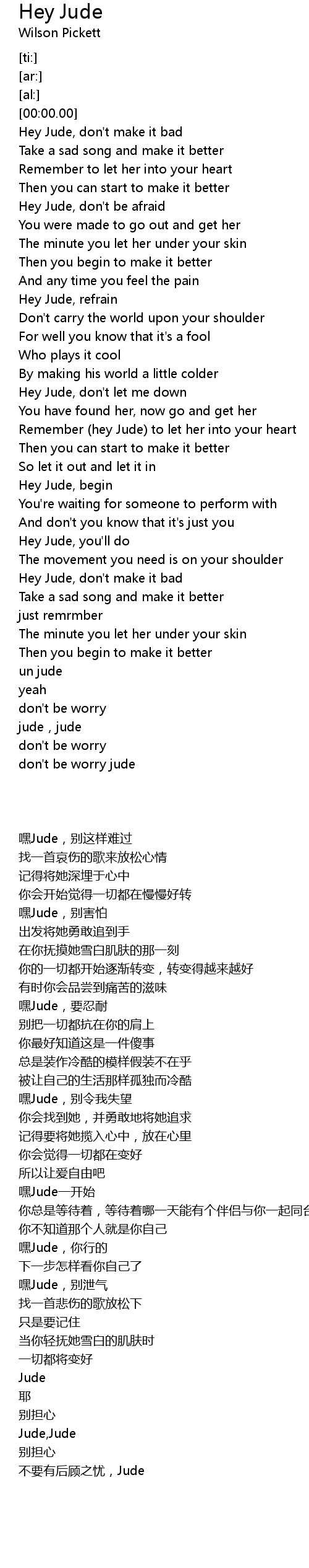 | [02:21.79] | Hey Jude, don' t make it bad |