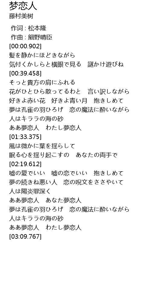 | [03:00.598] | ああ夢恋人 わたし夢恋人 |