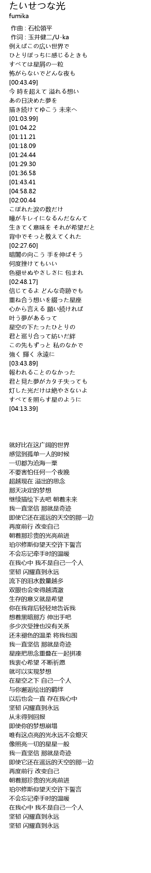 | [04:33.85][01:24.44] | たいせつな光へと |
