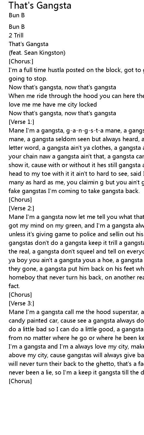 Mane I'm a gangsta now let me tell you what that means, see I'm a gangsta always got my mind on my green, and I'm a gangsta always gon do what I got to do, unless it's giving game to police and sellin out his crew, that's something gangstas don't do a gangsta keep it trill a gangsta do a crime he do his time on the real, a gangsta don't squeel and tell on everyone he know, put a jacket on ya boy you ain't a gangsta yous a hoe, a gangsta hold his homeboys down when they gone, a gangsta put him back on his feet when he home, a gangsta is a homeboy that never turn his back, on another real homie that's a well known fact. |