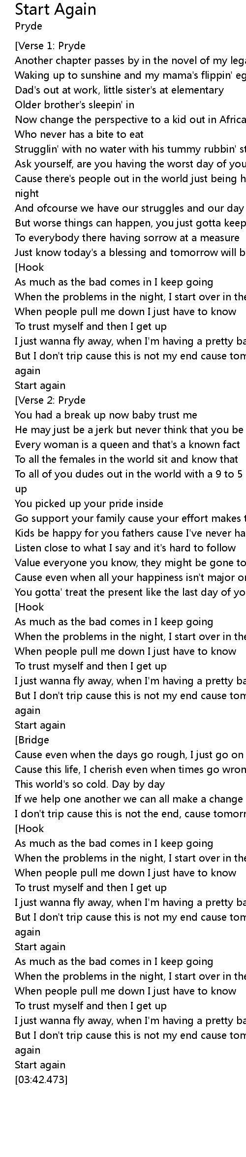 | [03:09.062] | But I don't trip cause this is not my end cause tomorrow we start again |
