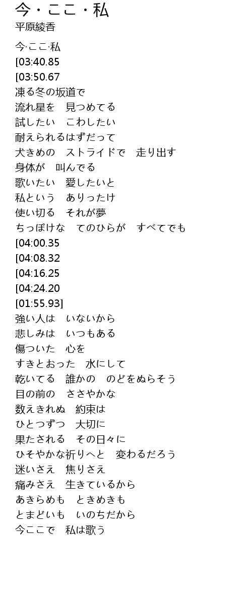 | [00:12.00][03:40.85][04:35.04][05:06.37] | 平原綾香-今·ここ·私 |