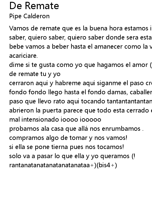 | Vamos de remate que es la buena hora estamos iniciando que suban la nota, quiero saber, quiero saber, quiero saber donde sera esta vez (bis) vamos a beber oye bebe vamos a beber hasta el amanecer como la ve rosando mi piel toda la noche te acariciare. | |