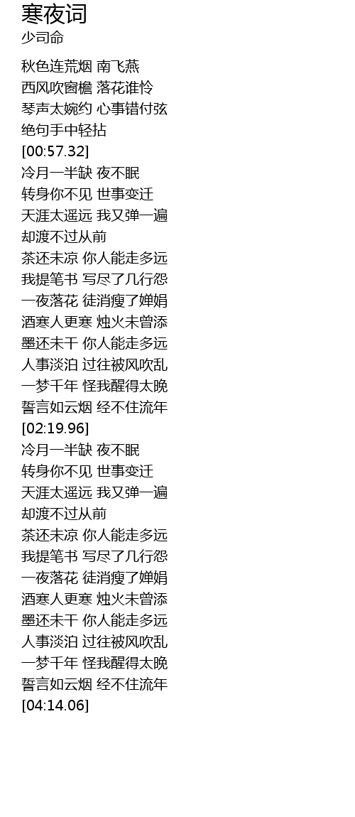 | [00:59.00] | 冷月一半缺 夜不眠 |