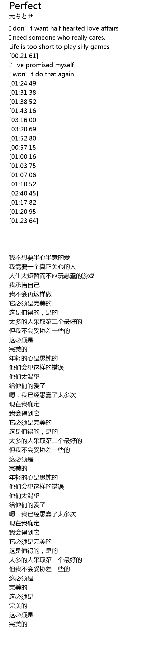 | [02:47.58][01:24.49][00:28.46] | It' s got to be perfect |