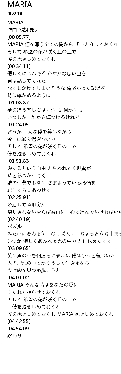 | [04:01.35] | MARIA そんな時はあなたの愛に もたれて眠らせておくれ |