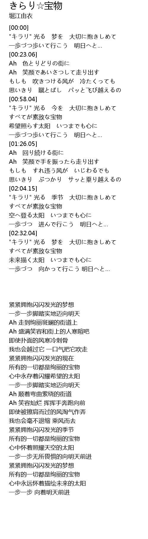 | [02:54.27] | "キラリ" 光る 梦を 大切に抱きしめて |