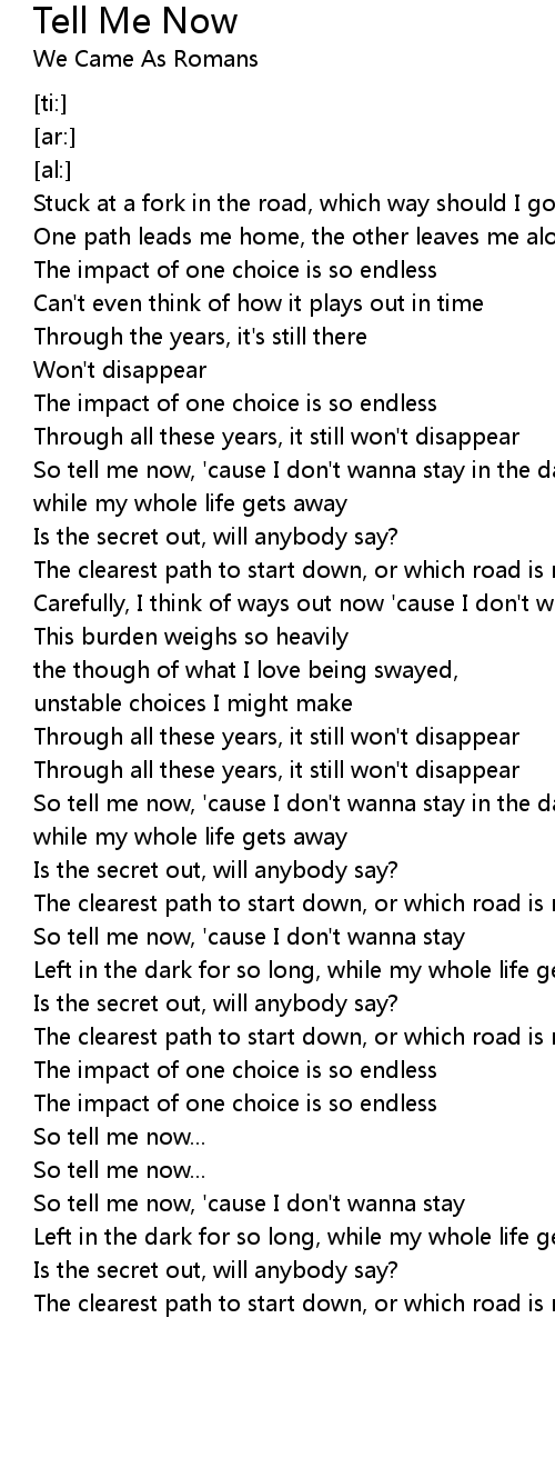 So tell me now, 'cause I don't wanna stay in the dark for so long while my whole life gets away |