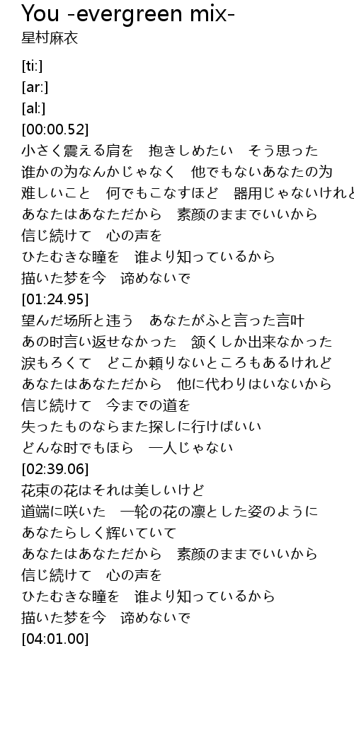 | [00:55.21] | あなたはあなただから 素颜のままでいいから |