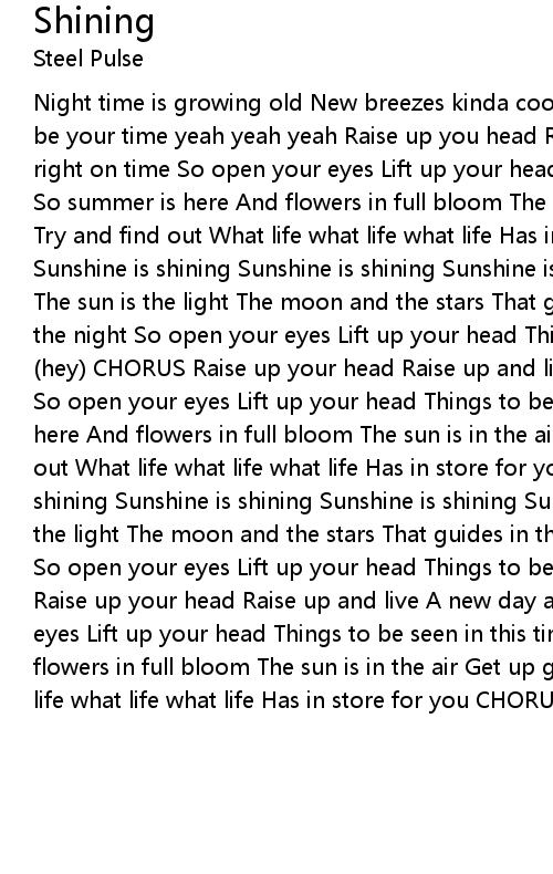 Night time is growing old New breezes kinda cool So raise up raise up This could be your time yeah yeah yeah Raise up you head Raise up and live A new day again right on time So open your eyes Lift up your head Things to be said in this time So summer is here And flowers in full bloom The sun is in the air Get up get out Try and find out What life what life what life Has in store for you CHORUS Sunshine is shining Sunshine is shining Sunshine is shining Sunshine is shining The sun is the light The moon and the stars That guides in the day and loves in the night So open your eyes Lift up your head Thing to be seen in this time (hey) CHORUS Raise up your head Raise up and live A new day again right on time So open your eyes Lift up your head Things to be said in this time So summer is here And flowers in full bloom The sun is in the air Get up get out Try and find out What life what life what life Has in store for you CHORUS Sunshine is shining Sunshine is shining Sunshine is shining Sunshine is shining The sun is the light The moon and the stars That guides in the day and loves in the night So open your eyes Lift up your head Things to be seen in this time (hey) CHORUS Raise up your head Raise up and live A new day again right on time So open your eyes Lift up your head Things to be seen in this time For summer is here And flowers in full bloom The sun is in the air Get up get out Try and find out What life what life what life Has in store for you CHORUS |
