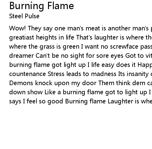 Wow! They say one man's meat is another man's poison But I've chosen the greatiast heights in life That's laughter is where there lots of fun Sorrow gone where the grass is green I want no screwface passenger Nightmare no I'm a sweet dreamer Can't be no sight for sore eyes Got to vitalise I self show Like a burning flame got light up I life easy does it Happiness is a cheerful countenance Stress leads to madness Its insanity confirmed by humanity Insanity Demons knock upon my door Them think dem can kill joy You can't keep a good man down show Like a burning flame got to light up I life easy does it. Lots of fun says I feel so good Burning flame Laughter is where there's lots of fun. |