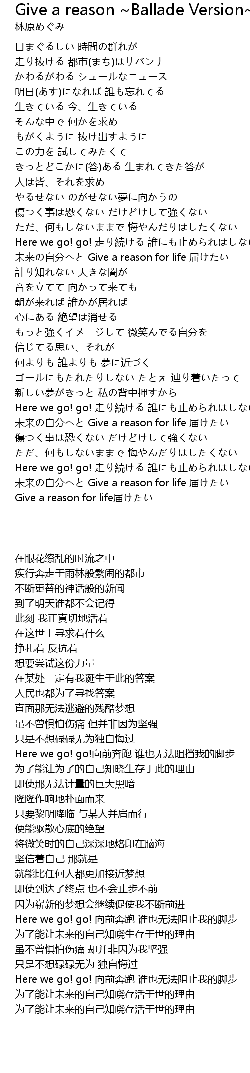 | [03:25.59] | 未来の自分へと Give a reason for life 届けたい |