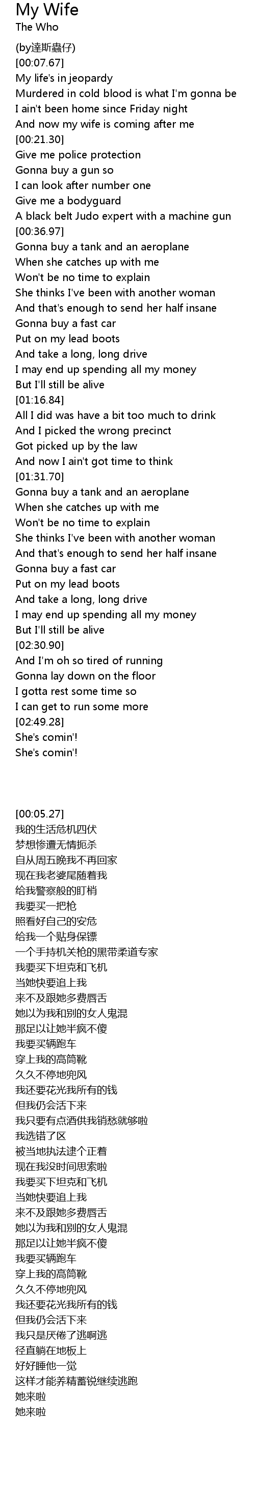 | [00:18.18] | And now my wife is coming after me |