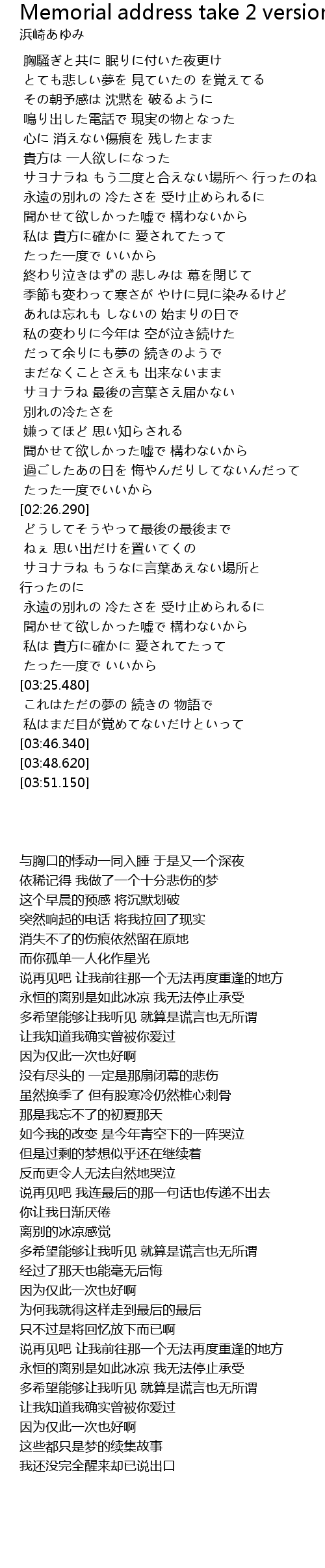 | [00:42.580] | サヨナラね もう二度と合えない場所へ 行ったのね |