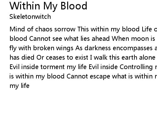 | Mind of chaos sorrow This within my blood Life of sickness evil This within my blood Cannot see what lies ahead When moon is gone and the son is dead Cannot fly with broken wings As darkness encompasses all things Something inside of me has died Or ceases to exist I walk this earth alone Evil demons rule my life Evil inside torment my life Evil inside Controlling my life Cannot escape what is within my blood Cannot escape what is within my blood Evil demons now control my life |