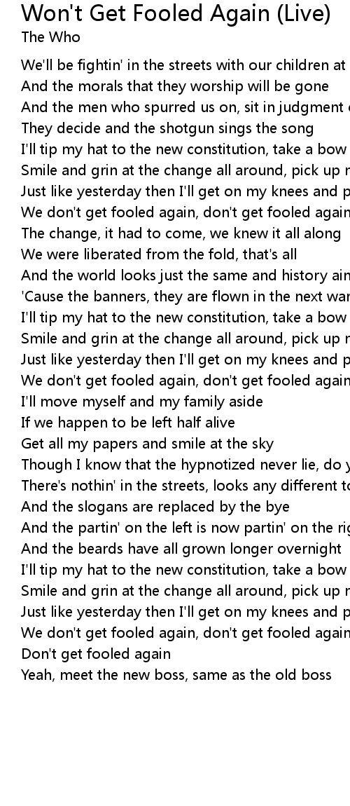We don't get fooled again, don't get fooled again, no, no, no, no, no |