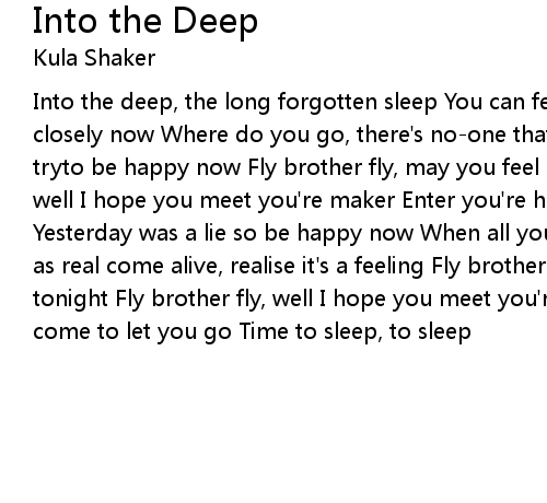 Into the deep, the long forgotten sleep You can feel that you're eyes are shut closely now Where do you go, there's no-one that can know As you lie you can tryto be happy now Fly brother fly, may you feel love tonight Fly brother fly, well I hope you meet you're maker Enter you're heart, and never let it part Yesterday was a lie so be happy now When all you can feel is what you can take as real come alive, realise it's a feeling Fly brother fly, may you feel love tonight Fly brother fly, well I hope you meet you're maker I know, the time has come to let you go Time to sleep, to sleep |