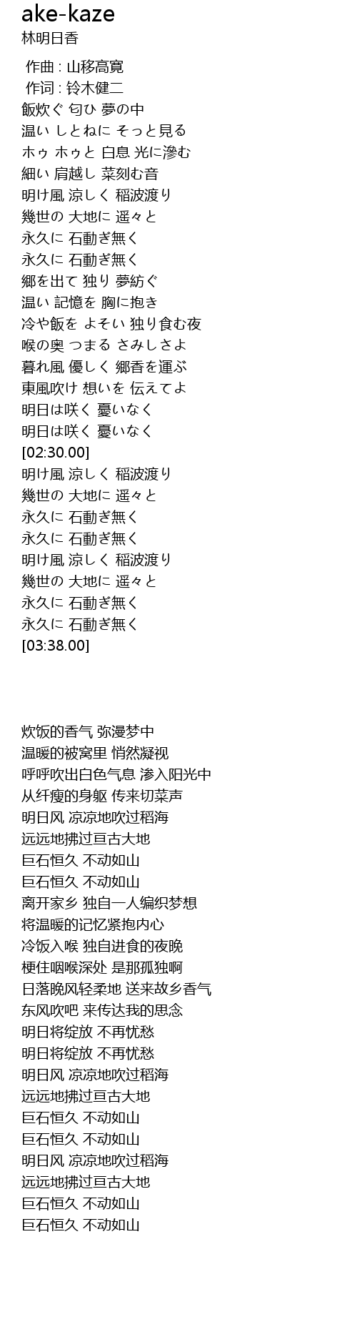 | [02:52.00] | 明け風 涼しく 稲波渡り |