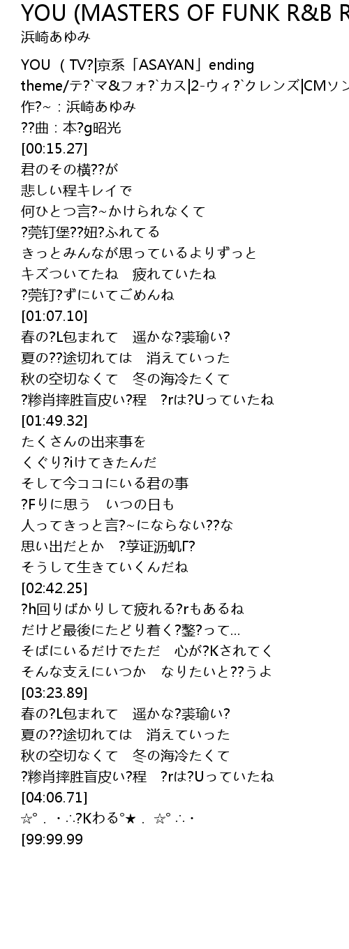 [00:01.35] YOU (TV?|京系「ASAYAN」ending theme/テ?`マ&フォ?`カス|2-ウィ?`クレンズ|CMソング)