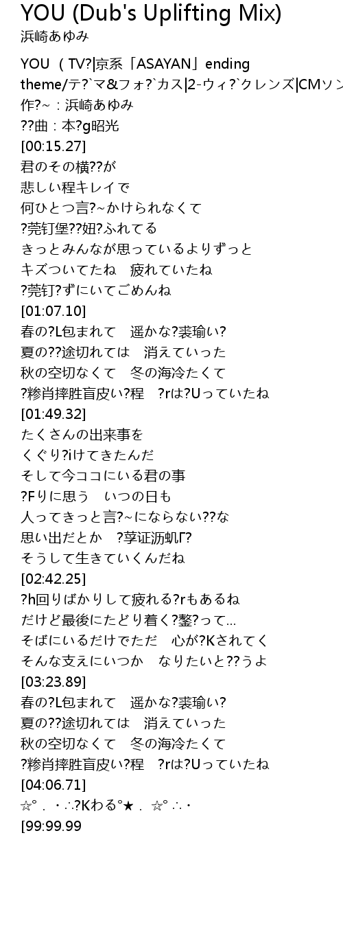 [00:01.35] YOU (TV?|京系「ASAYAN」ending theme/テ?`マ&フォ?`カス|2-ウィ?`クレンズ|CMソング)