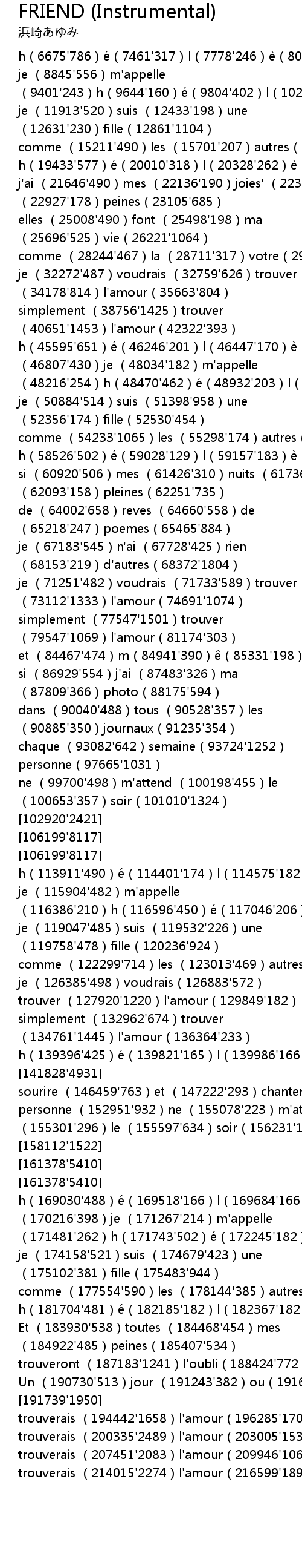 | [169030'4279] | h 169030' 488e 169518' 166 l 169684' 166e 169850' 366 ne' 170216' 398 je 171267' 214 m' appelle 171481' 262 h 171743' 502e 172245' 182 l 172427' 198e 172625' 254 ne 172879' 422 |