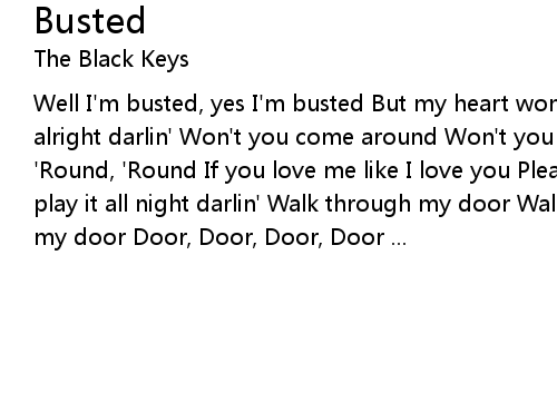 | Well I'm busted, yes I'm busted But my heart won't let me die. If you feel alright darlin' Won't you come around Won't you come around 'Round, 'Round, 'Round, 'Round If you love me like I love you Please won't you let me know I'll play it all night darlin' Walk through my door Walk through my door Walk through my door Door, Door, Door, Door ... |