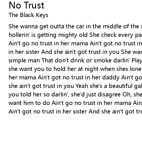 She wanna get outta the car in the middle of the road And her screaming and hollerin' is getting mighty old She check every paper when you step out the room Ain't go no trust in her mama Ain't got no trust in her daddy Ain't got no trust in her sister And she ain't got trust in you She want a simple life She need a simple man That don't drink or smoke darlin' Play in a rock & roll band Oh, but she want you to hold her at night when shes lonely and blue Ain't go no trust in her mama Ain't got no trust in her daddy Ain't got no trust in her sister And she ain't got trust in you Yeah she's a beautiful gal when she wanna be But if you told her so darlin', she'd just disagree Oh, she hates your job and what you want him to do Ain't go no trust in her mama Ain't got no trust in her daddy Ain't got no trust in her sister And she ain't got trust in you |