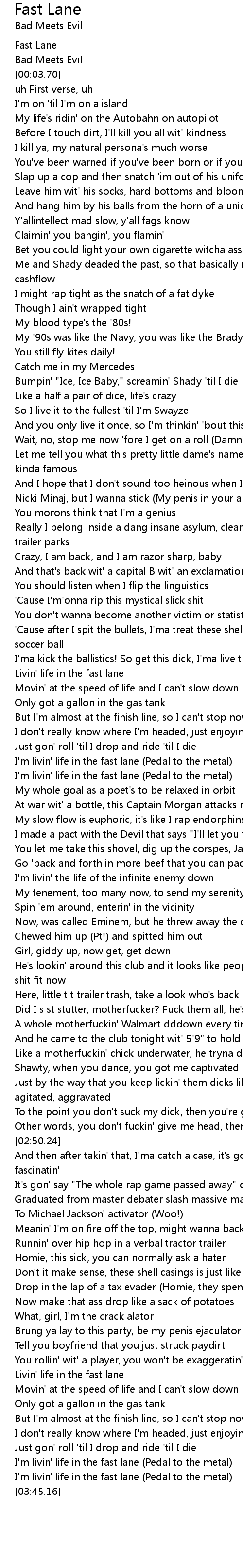 | [03:42.50] | I'm livin' life in the fast lane (Pedal to the metal) |