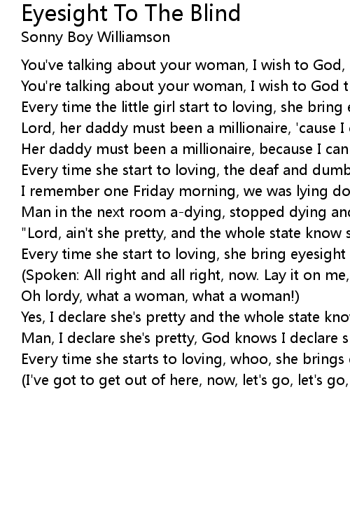 Every time she starts to loving, whoo, she brings eyesight to the blind |