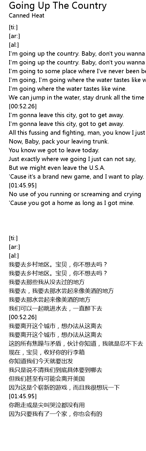 [00:17.48] I'm going up the country. Baby, don't you wanna go?