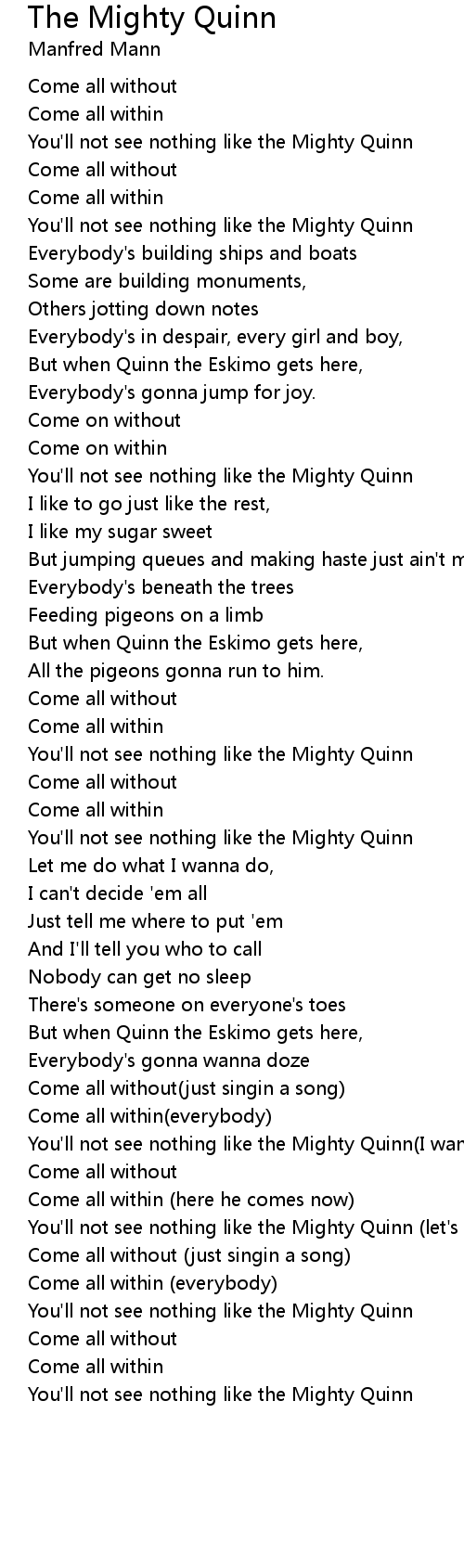 You'll not see nothing like the Mighty Quinn (let's come on and sing) |