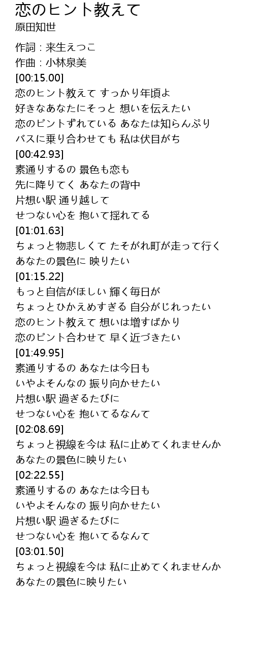 | [00:15.15] | 恋のヒント教えて すっかり年頃よ |