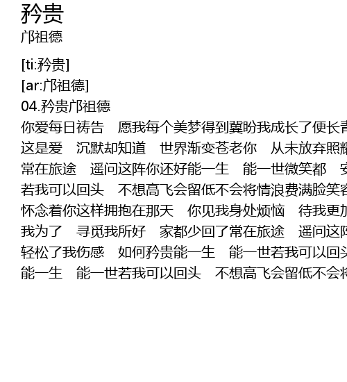 | [01:01.50] | 常在旅途 遥问这阵你还好能一生 能一世微笑都 安稳了我的心轻松了我伤感 如何矜贵能一生 能一世 |