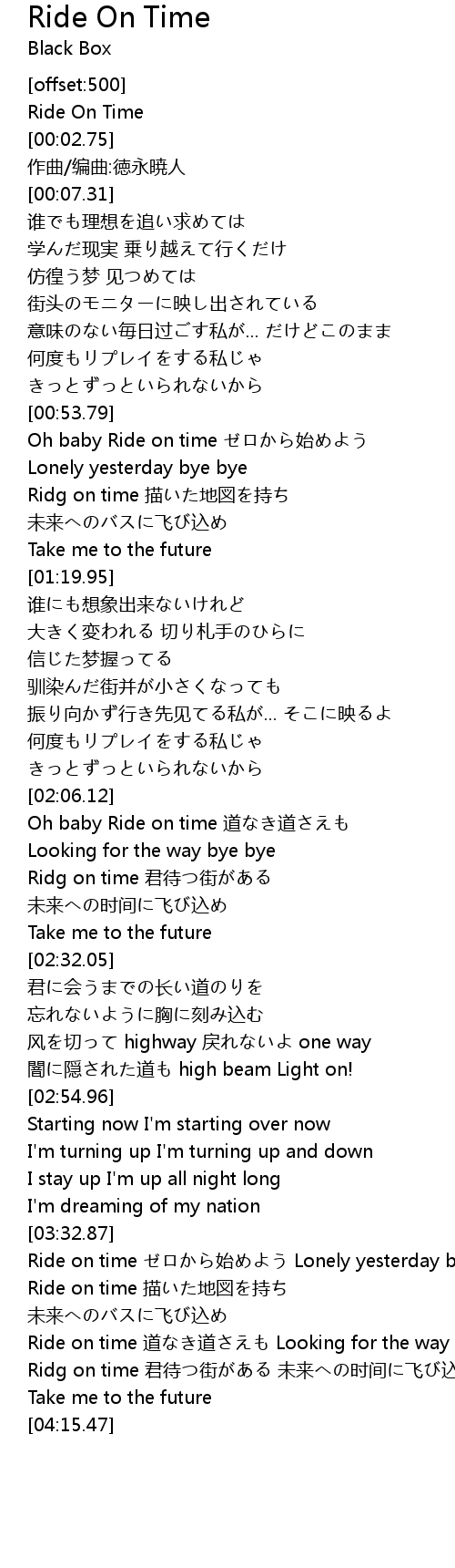 | [03:33.53] | Ride on time shi Lonely yesterday bye bye |