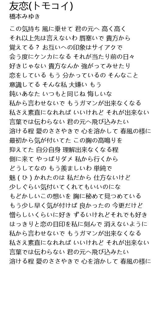 | [00:00.310] | この気持ち 風に乗せて 君の元へ 高く高く |