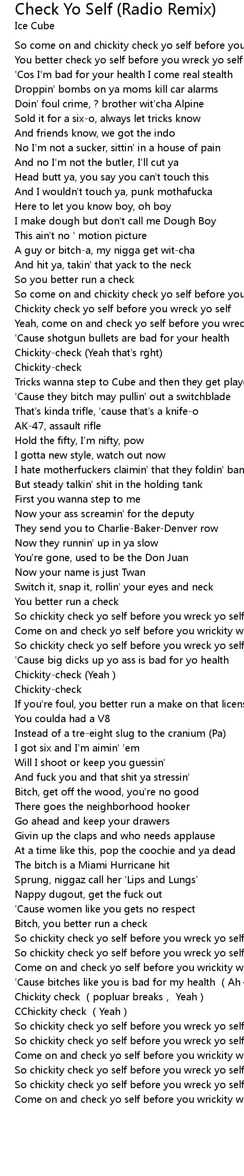 | [00:00.00] | So come on and chickity check yo self before you wreck yo self |