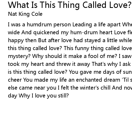 I was a humdrum person Leading a life apart When love flew in through my window wide And quickened my hum-drum heart Love flew in through my window I was so happy then But after love had stayed a little while Love flew out again What is this thing called love? This funny thing called love? Just who can solve its mystery? Why should it make a fool of me? I saw you there one wonderful day You took my heart and threw it away That's why I ask the Lord in Heaven above What is this thing called love? You gave me days of sunshine You gave me nights of cheer You made my life an enchanted dream 'Til somebody else came near Somebody else came near you I felt the winter's chill And now I sit and wonder night and day Why I love you still? |